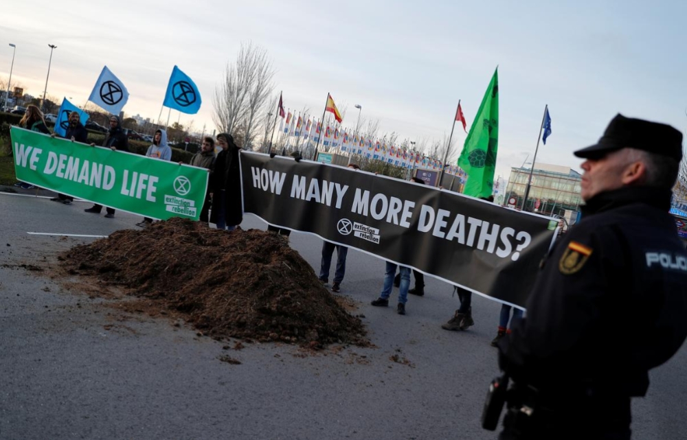 로이터통신 등 외신들에 따르면 환경운동가들은 마드리드 회의장 인근에서 말똥을 쌓아놓는가 하면 '모의 교수형' 퍼포먼스를 펼쳤다.