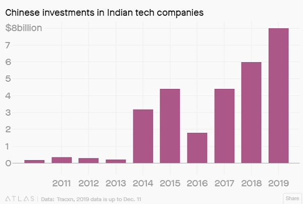 방갈루루에 거점을 둔 데이터 분석 회사 '트랙슨(Tracxn)‘에 따르면 중국의 인도투자(벤처캐피탈회사 뿐만 아니라 중국에 거점을 둔 모든 기업들의 투자를 포함)는 10년 전의 2억 달러 미만에서 올해 12월 11일까지 80억 달러에 달한다. 중국의 인도에 대한 관심은 지난 2014년부터 높아졌다. 중국의 인도투자가 지난 2013년 2억1400만 달러에서 2014년 32억 달러로 급증했다.