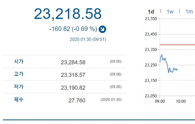 신종 코로나바이러스 감염증인 '우한 폐렴'에 대한 불안감이 지속되는 가운데 30일 코스피도 하락 하고 있다.