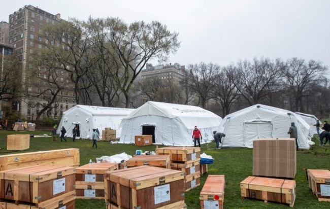 미국 뉴욕의 센트럴파크에는 야영병원으로 사용되는 텐트 10여 개가 설치돼 평시로서는 지금까지 상상조차 할 수 없었던 광경이 펼쳐졌다. 지나가던 행인 여성(57)은 AFP에 대해 ‘컨테이젼(Contagion)’ 영화와 같은 상황이 현실에서 벌어지고 있다며 “여기서 실제로 일어나는 것을 보는 것은 현실과 거리가 멀다”고 말했다.