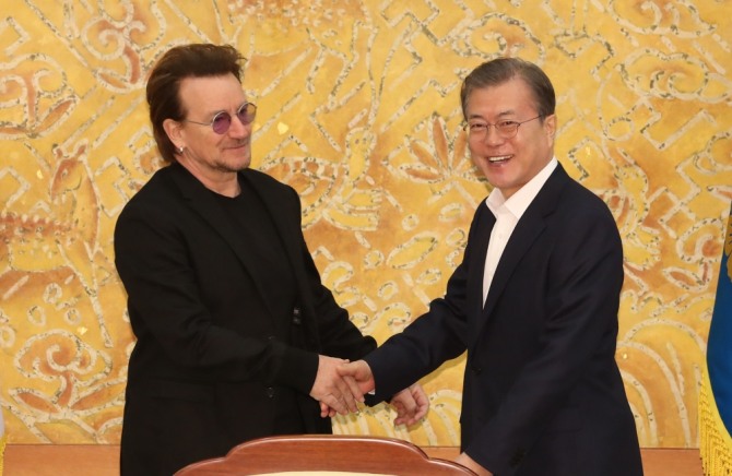 보노는 노벨 평화상 후보에도 오른 인권활동가이며, 지난해 12월 내한공연 당시 문 대통령과 면담을 하기도 했다.
