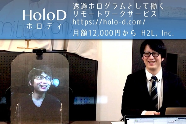 홀로디는 영상과 신체의 움직임을 투명홀로그램으로 직장에 전달하는 것으로 원격근무자와의 가벼운 커뮤니케이션을 지원한다. 1만2000엔부터 월 사용요금으로 이용가능하다.