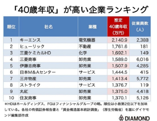 이미지 확대보기일본 주간지 다이야몬드는 12일(현지시간) 올해로 네 번째로 발표하는 ‘40세 최고연봉기업 랭킹’에서 키엔스가 일본내 40세 직장인 최고 연봉기업으로 또다시 등극했다고 밝혔다.