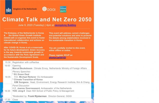 이미지 확대보기이번 기후토론회는 기후 변화 대응에 국제 공조의 필요성을 강조하고, 네덜란드와 유럽연합의 그린딜을 소개하며, 지속가능한 성장을 위한 기후변화대응 전략을 토론하기 위해 기획되었다. 토론회는 온/오프라인으로 병행 개최하며 네덜란드 기후변화대사 마르셀 뵈커봄(Marcel Beukeboom), 주한유럽연합대표부 대사 마이클 라이터러(Michael Reiterer), 주한네덜란드 대사 요아나 도너바르트(Joanne Doornewaard), 김성우 김&장 환경에너지연구소 소장, 유종일 KDI 국제정책대학원 원장이 토론자로 나설 예정이다. 사회는 GGGI 사무총장 프랭크 릭스베르만(Frank Rijsberman)이 맡을 예정이다.