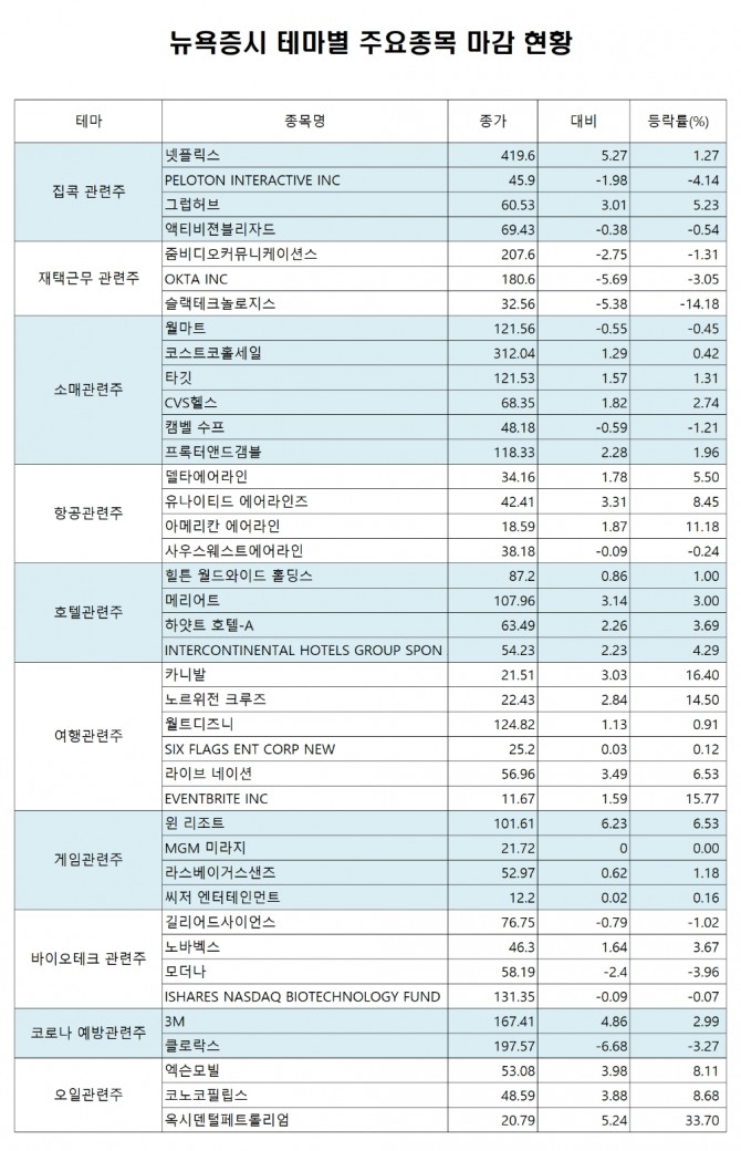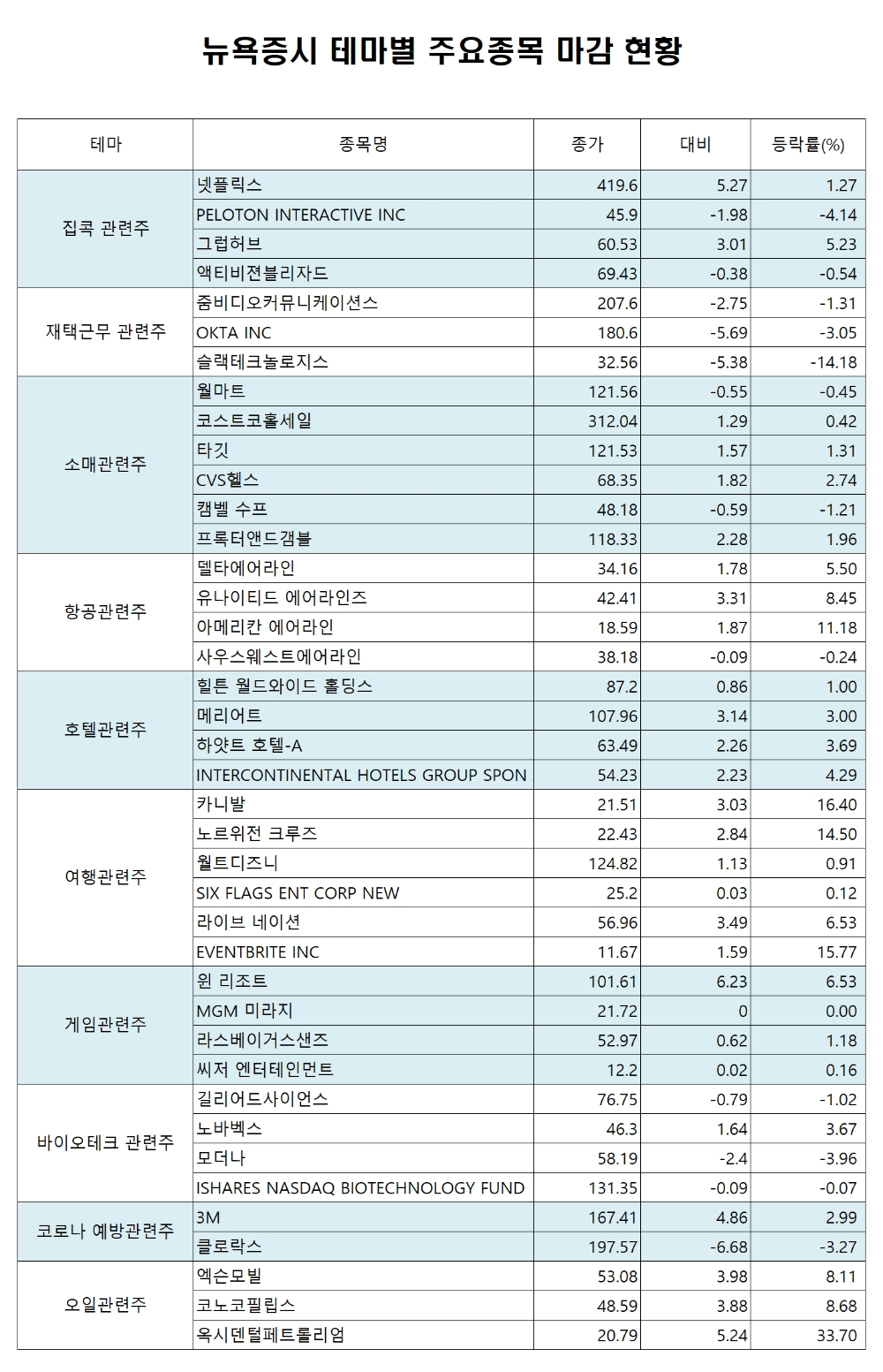 넷플릭스 419.6 (1.27%), PELOTON INTERACTIVE INC 45.9 (-4.14%), 그럽허브 60.53 (5.23%), 액티비젼블리자드 69.43 (-0.54%)