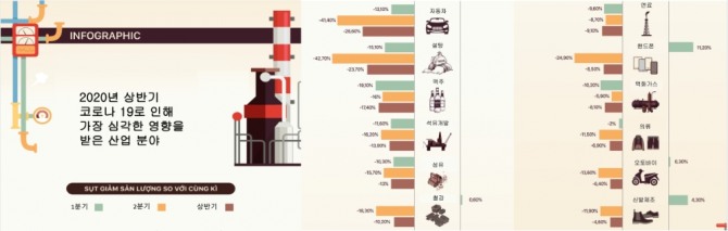 올해 들어 상반기까지 생산량을 전년보다 크게 줄였던 주요 산업 제품은 자동차(-26.5%), 맥주(-17.4 %), 원유(-13.9 %), 합성섬유(-13 %), 철, 조강( -10.2 %), 천연가스(-9.1 %), 휴대폰( -8.5 %), LPG(-8.1 %), 의류( -6.9 %), 오토바이(-6.4 %) 가죽 잡호( -4.6 %) 등으로, 코로나19로 수출과 소비가 감소한 품목이다.