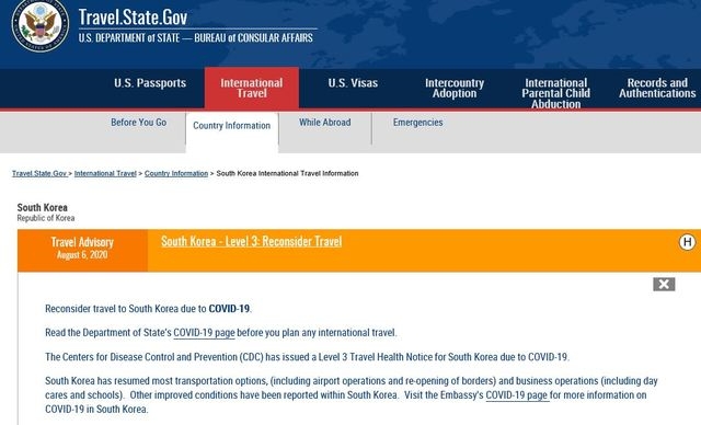 이미지 확대보기미국 정부는 한국에 대한 여행경보를 3단계 '여행 재고'로 공지했다.