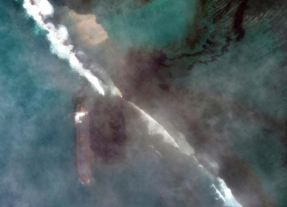 이미지 확대보기교도통신에 따르면 일본 나가사키 해운 소유로 미쓰이 O.S.K. 상선이 운영하는 대형 선박 와카시오호는 중국에서 출발해 브라질로 향하다가 지난 7월 25일 모리셔스 해안의 산호초에 좌초했고, 선체에 균열이 생기며 대량의 기름이 유출되고 있다. 해당 선박은 4천t의 연료를 싣고 있는 것으로 확인됐다.