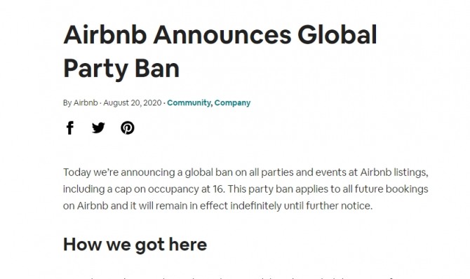 에어비앤비는 이날 낸 발표문에서 “신종 코로나바이러스(코로나19) 사태에 대한 공공보건의 차원에서 전세계적으로 파티를 금지하기로 했다”면서 “이날 이후로 이뤄지는 숙박 신청에서부터 새로운 규정이 적용되며 별도의 공지가 있을 때까지 이 규정은 무기한 시행된다”고 밝혔다.