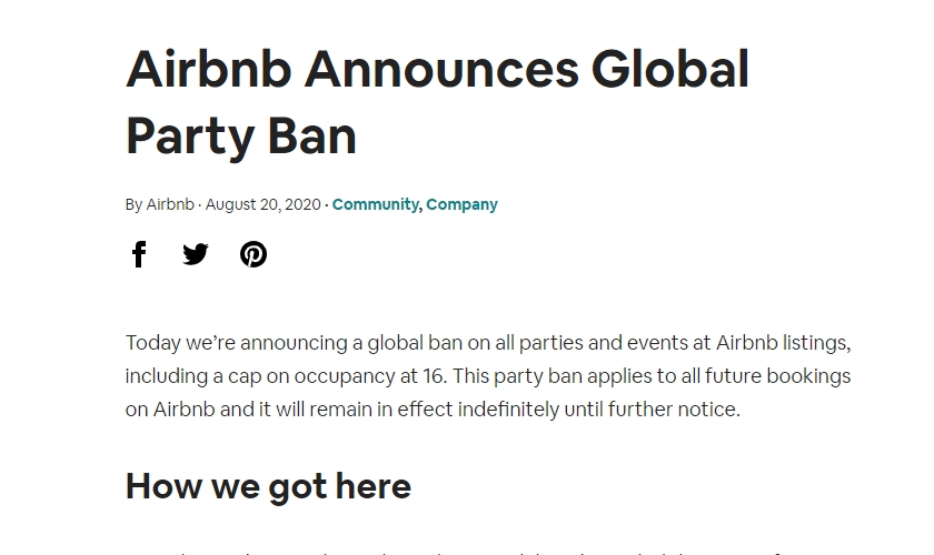 에어비앤비는 특히 “코로나19 사태로 술집이나 클럽을 자유롭게 이용하지 못하는 사람들이 에어비앤비 숙소를 빌려 자신들의 스트레스를 푸는 방법으로 에어비앤비 숙소를 악용해온 측면도 있어 이같은 결정을 내리게 됐다”고 설명했다.