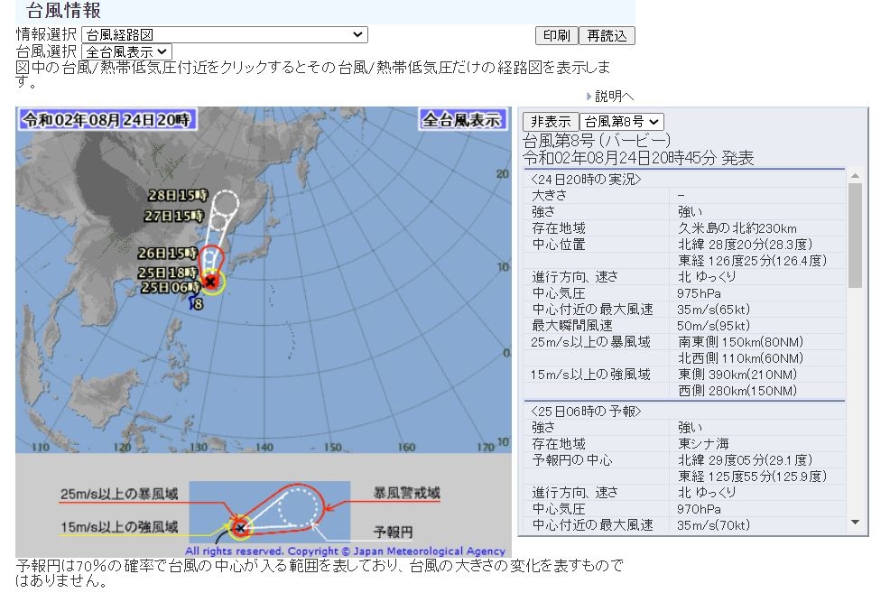 기상청은 24일 밤 제8호 태풍 "바비(BAVI)"가 중심기압 975hPa, 중심최대풍속 115km/h(32m/s)로 일본 오키나와 북서쪽 해상에서 시속 12km로 북북 동진하고 있다고 밝혔다. 이 태풍은 25일 제주도 남쪽 해상으로 북상하여 26일 제주도 서쪽을 경유하여 한반도 서쪽으로 상륙할 것으로 보인다. 25일 밤 제주도부터 태풍의 영향권에 들어 27일 까지 한반도 전역이 태풍의 영향권에 들 것으로 예상된다. 매우 강한 바람과 일부 지역에서는 많은 비로 인한 피해가 예상된다. 태풍의 이동 속도와 강도 그리고 이동경로는 수시로 변경될 수 있다. 기상청은 또 날씨와 관련하여 25일까지 전국이 가끔 구름 많다가 26일 차차 흐려지겠으며 제주도에는 25일 새벽 비가 시작될 것으로 보았다.