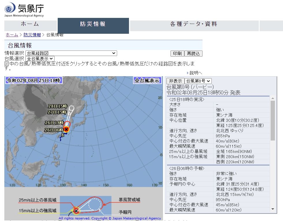 다음은 일본 기상청 태풍 8 호 (바비) 특보