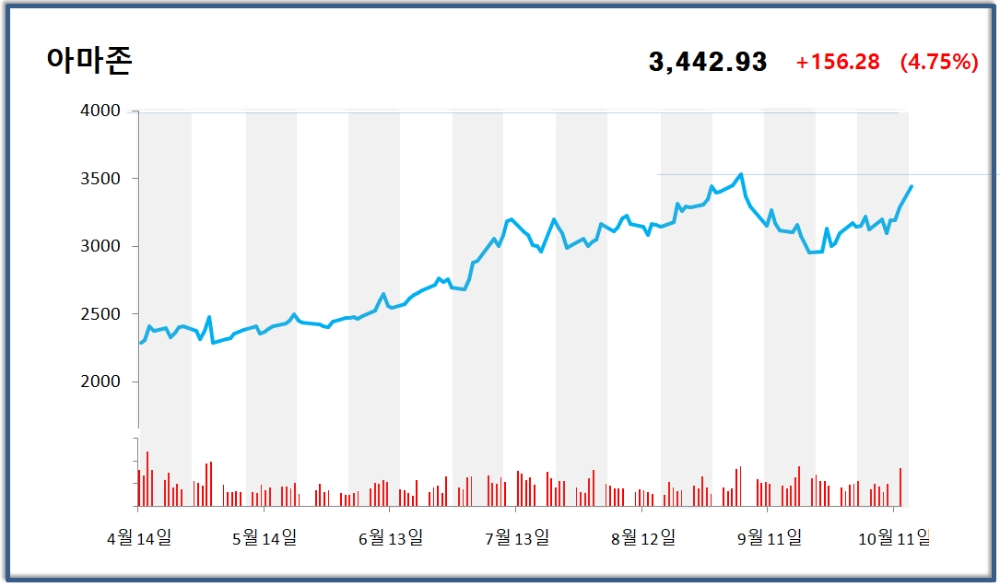 아마존 지난 12일 4.75% 급등한 3442.93 달러로 마감했고, 13일 개장을 앞둔 시점에서 프리마켓 시세는 0.79% 상승한 3470달러를 기록하고 있다.