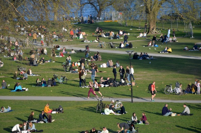 스웨덴 스톡홀름의 한 공원에 신종 코로나바이러스 감염증(코로나19) 발생에도 사람들이 모여 화창한 날씨를 즐기고 있다. 사진=뉴시스