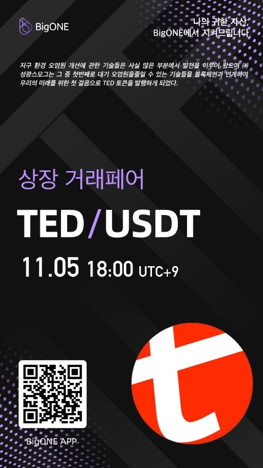 이날 상장 행사에서 TED 재단 측은 "지구 환경오염을 해소할 수 있는 토종 기술력을 바탕으로 직접적인 환경 오염원 개선과 블록체인 생태계 구축에 이바지하겠다"고 포부를 밝혔다. 이어 TED의 韓中 동시 상장을 이룬 빅원 코리아 팀은 "지난 반년간의 한국 시장 상장 마케팅에서 TED만큼 강력한 아이템을 장착한 코인은 없었다"며, "향후 중국을 비롯한 글로벌 마케팅을 펼칠 경우 TED의 상승 동력은 많다"고 덧붙였다.