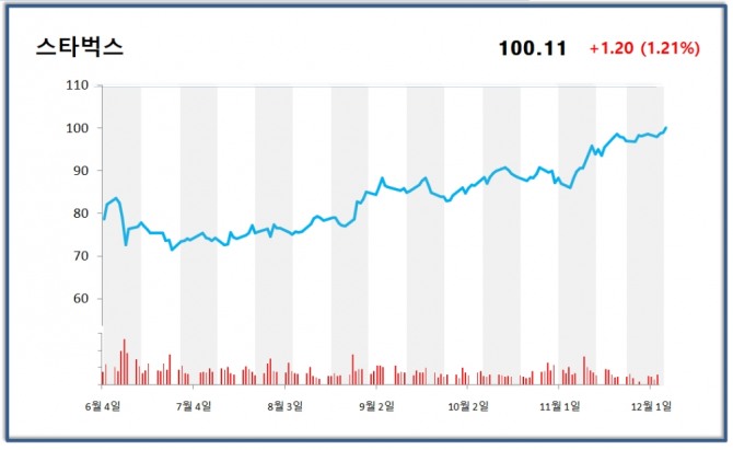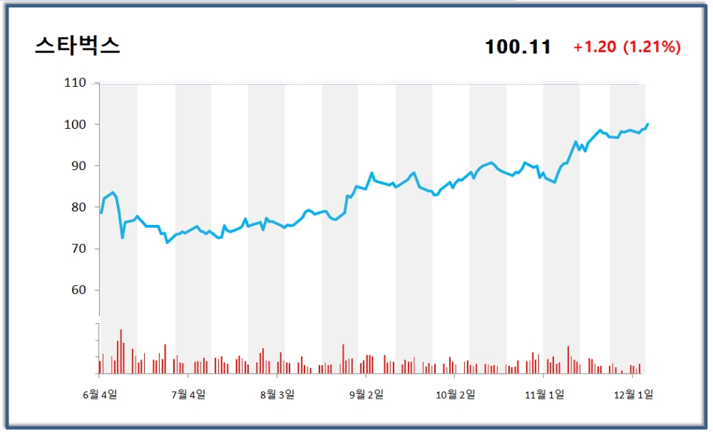 스타벅스는 3일(현지시각) 전 거래일 대비 1.21% 상승한 100.11에 장을 마감했다.