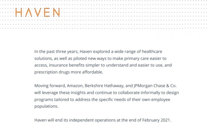 헤이븐은 자사 홈페이지에 올린 폐업 안내문에서 “지난 3년간 다양한 방식으로 의료서비스 개선을 위한 해법, 건강보험 절차를 이용하기 쉽고 이해하기 쉽게 간소화하는 방안 등을 모색해왔으나 다음달 폐업하기로 했다”고 밝혔다.