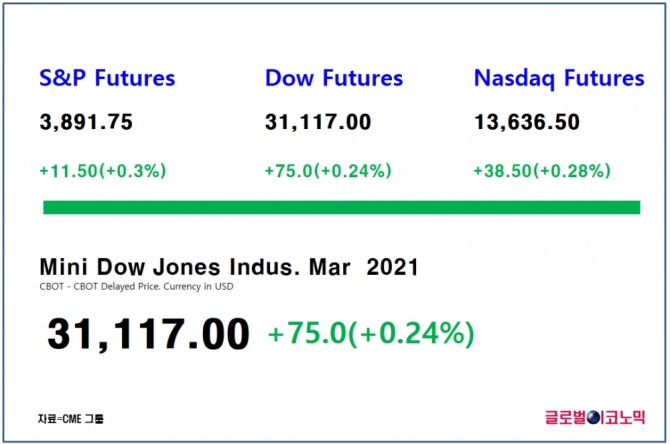 스탠더드 앤드 푸어스(S&P) 500 지수 선물은 0.3%(11.5포인트) 상승한 3891.75에 거래되고 있고, 나스닥 100 선물은 0.28%(38.5포인트)상승한 1만3636.5에 거래되고 있다.