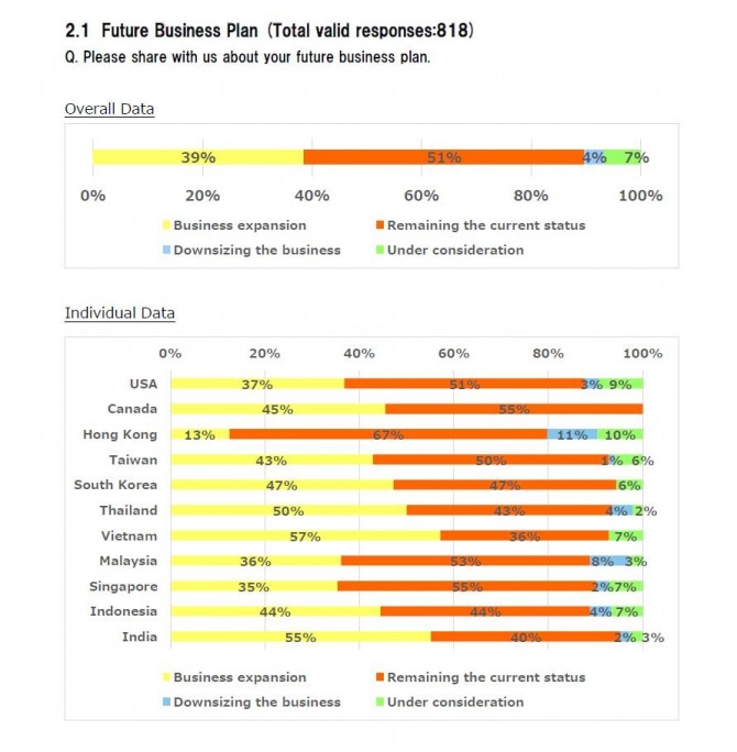 베트남과 인도 다음으로 일본 기업들이 투자를 늘리겠다는 입장을 많이 밝힌 나라는 태국(50%), 한국(47%), 캐나다(45%), 인도네시아(44%) 등으로 조사됐다.