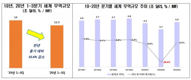 9일 전경련에 따르면 코로나19로 인한 각국 경제봉쇄의 영향으로 지난해 1~3분기 세계 교역규모는 전년 동기 대비 10.6% 감소한 12조5168억 달러에 그쳤다.