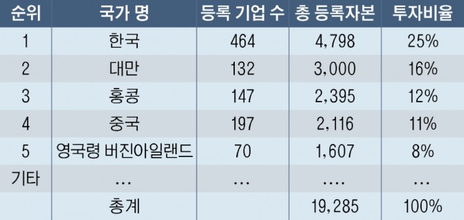 베트남 섬유·의류협회에 따르면 1989년부터 2019년까지 30년간 외국인직접투자는19조2,850억 달러에 달했다. 이 중 섬유·의류 분야의 상위 투자국은 한국, 대만, 홍콩, 중국 및 영국령 버진아일랜드가 있다. 한국은 464개의 기업 등록, 총 등록 자본 479억 8800만 달러로 30년간 섬유·의류 분야 누적 투자규모와 기업 개수에서 모두 1위를 차지했다. 대만은 132개 기업을 등록했으나, 총 30억 달러를 투자하여 2위를 차지했다. 홍콩은 147개 기업을 등록하고 총 자본금 23억9,500만 달러로 3위 투자 국 이며, 중국은 197개 기업 수, 21억1,600만 달러를 투자한 4위 투자 국이다. 영국령 버진아일랜드는 70개의 기업을 등록했으나 총 투자 자본은 1,670억 달러로 5위 투자국이다. 그 외에 싱가포르 8억3,400만 달러, 사모아 7억9,300만 달러, 터키 6억6,000만 달러, 일본 4억3,400만 달러, 세이셸 4억8,490만 달러, 영국 3억7,200만 달러 등의 국가가 베트남의 섬유·의류분야에 투자하고 있다.