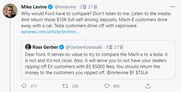 그의 트윗은 팔로워들 사이에서 뜨거운 반응을 일으켰다. 주로 모델Y가 더 좋은 전기차냐 머스탱 마하E가 더 좋은 전기차냐는 식의 논쟁이었다. 마침 비번이어서 쉬고 있던 마이크 레빈 포드차 대변인도 이 트윗을 봤고 곧바로 반박하는 글을 올렸다.