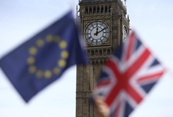 런던 시계탑 주변에 게양된 유럽기와 영국 국기. 사진=로이터