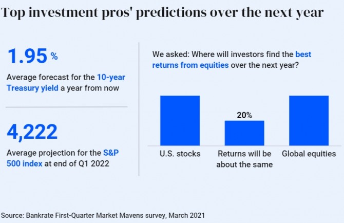 뱅크레이트 설문조사에 응한 전문가들의 의견을 취합해 평균을 낸 결과 올 1분기를 마감하는 지난달 24일 3,889.14를 기록한 S&P 500 지수가 꾸준히 상승해 내년 같은 시점에는 4000선을 돌파해 4222 정도를 기록할 것으로 내다봤다.