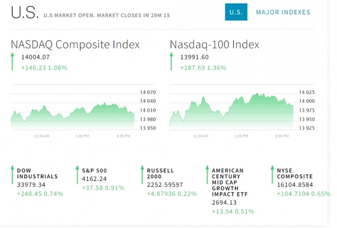 이미지 확대보기16일 뉴욕증시에 따르면 뉴욕증권거래소(NYSE)에서 다우존스 30 산업평균지수와 스탠더드앤드푸어스(S&P) 500 지수 그리고 기술주의 나스닥 지수 모두 오르고 있다. 다우지수와 S&P500지수는 장중 최고치를 경신했다.뱅크오브아메리카(BOA)와 씨티그룹은 올해 1분기 예상치를 상회하는 순이익을 거뒀다고 발표했다. 블랙록도 1분기 순익이 12억 달러, 주당순이익(EPS) 7.77달러를 기록했다고 발표했다.