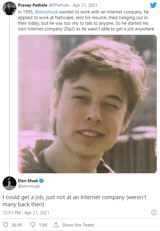 21일(이하 현지시간) 인디언익스프레스 등 외신에 다르면 ‘Pranay Pathole’이라는 이름의 트위터 사용자는 이날 머스크의 학창시절 모습으로 추정되는 사진과 함께 올린 게시물에서 “일론 머스크는 1995년 넷스케이프에 취업하고자 이력서를 보냈고 그 회사 로비에서 죽 때리는 것도 해봤지만 쑥스러워서 아무에게도 말을 걸지 못했다”면서 “넷스케이프 외에도 취업이 되지 않아 스스로 인터넷 업체(Zip2)를 차리게 된 것”이라고 주장했다.