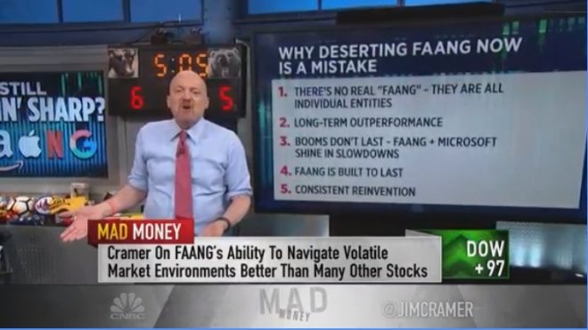 이미지 확대보기‘매드머니’ 진행자 짐 크레이머는 “그들은 현재 월가 패션쇼에서 인기가 없다. 일시적인 일”이라며 “팡(FAANG)이 끝났다고 믿고 던져버리고 싶은 충동을 참아야 한다"고 말했다.
