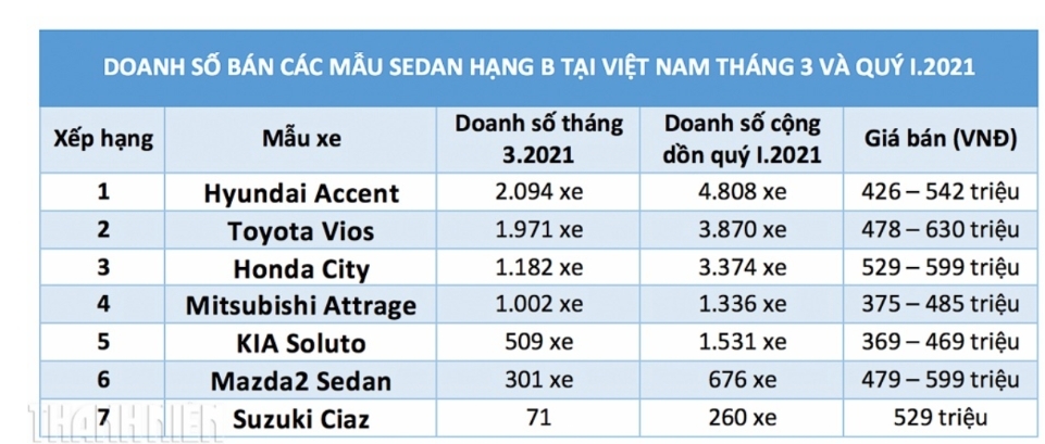 베트남자동차제조업협회(VAMA)와 현대차의 현지 합작사 TC모터의 집계에 따르면, 지난 3월 현대 엑센트, 도요타 비오스, 혼다 시티, 미쓰비시 아트리지, 기아 솔루토, 마쓰다 2 세단, 스즈키 시아즈 등 6억동 미만 B세그먼트 세단 판매량은 6230대다. 이는 전월 판매량 대비 56%(3458대) 증가한 수치다. B세그먼트 세단은 A세그먼트 차량을 제치고 베트남 자동차 시장의 강자로 자리매김하고 있다.
