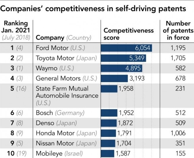 25일(현지시간) 일본 니혼게이자이신문에 따르면 전세계 주요 자율주행차 제조업체들이 지난 1월 기준으로 신규 특허를 출원한 실적을 조사해 분석한 결과 포드자동차와 도요타자동차가 각각 1위와 2위를 차지했다.