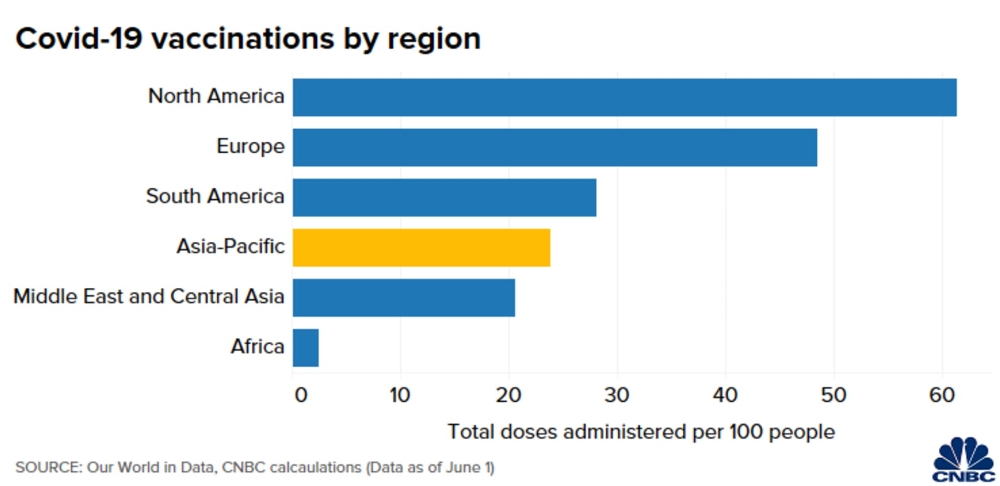 5일(현지시간) CNBC에 따르면 아워 월드(Our World)라는 백신 접종 추적 사이트를 통해 자체 집계한 결과 아태 지역 국가들의 인구 100명당 백신 접종 횟수는 23.8회로 파악됐다.