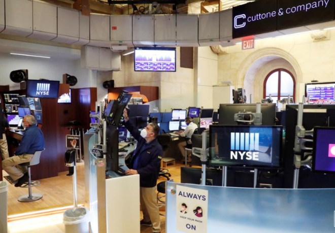 미국 뉴욕 맨해튼 자치구에서 트레이더들이 뉴욕증권거래소에서 작업을 할 때 마스크를 착용하고 있다. 사진=로이터