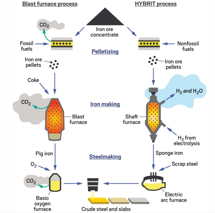 하이브리트(Hydrogen Breakthrough Ironmaking Technology) 공정도 이목을 끈다. 전통적 고로 기반 제강에 사용되는 코크스 및 기타 화석 연료를 대체하는 것을 목표로 하며 재생 가능한 전기로 생성된 수소에 의존한다.