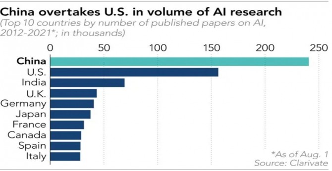 스탠포드대의 보고서에 따르면 지난해 중국은 AI 관련 학술 인용문에서 최초로 미국을 추월했다. 전체의 20.7%를 차지했다. 이는 미국의 19.8%를 증가한 수치다. 영국의 연구 전문가 클라리바테에 따르면 중국은 2012년 이후 AI에 관한 24만개의 학술 논문을 발표했으며, 이는 15만 개의 논문을 발표한 미국을 훨씬 능가한다.