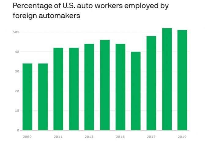 지난달 31일(현지시간) 온라인 매체 악시오스에 따르면 미국에 진출한 외국계 자동차 제조업체에서 일하는 미국인 근로자의 규모가 미국 자동차 업체에서 일하는 미국인 근로자를 사상 처음으로 추월했다.