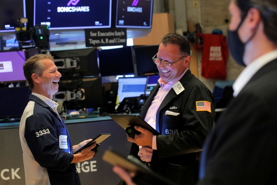 뉴욕증권거래소 트레이더들이 발게 웃고 있는 모습. 사진=로이터