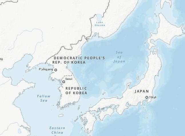 이미지 확대보기지역, 위치 정보를 제공하는 지리공간 사이트 메인메뉴 중 ‘지도 & 지리 서비스’에서 세계지도를 클릭하면 동해(East Sea)를 일본해로 적은 것을 확인할 수 있다.