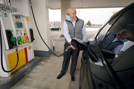 미국의 한 운전사가 주유소에서 자신의 자동차에 휘발유를 넣고 있는 장면. 사진=AP/뉴시스