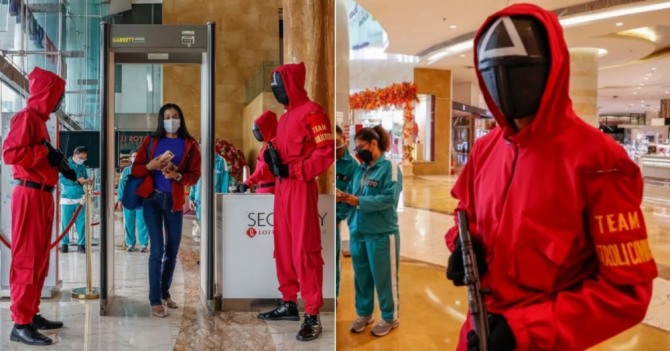 이미지 확대보기인도네시아 현지 매체 매셔블 SE 아시아는 21일(현지 시간) 인도네시아 자카르타 롯데쇼핑 애비뉴 쇼핑몰 경비원이 '오징어 게임'에 등장하는 치명적인 경비원으로 분장해 눈길을 끌고 있다고 보도했다.
