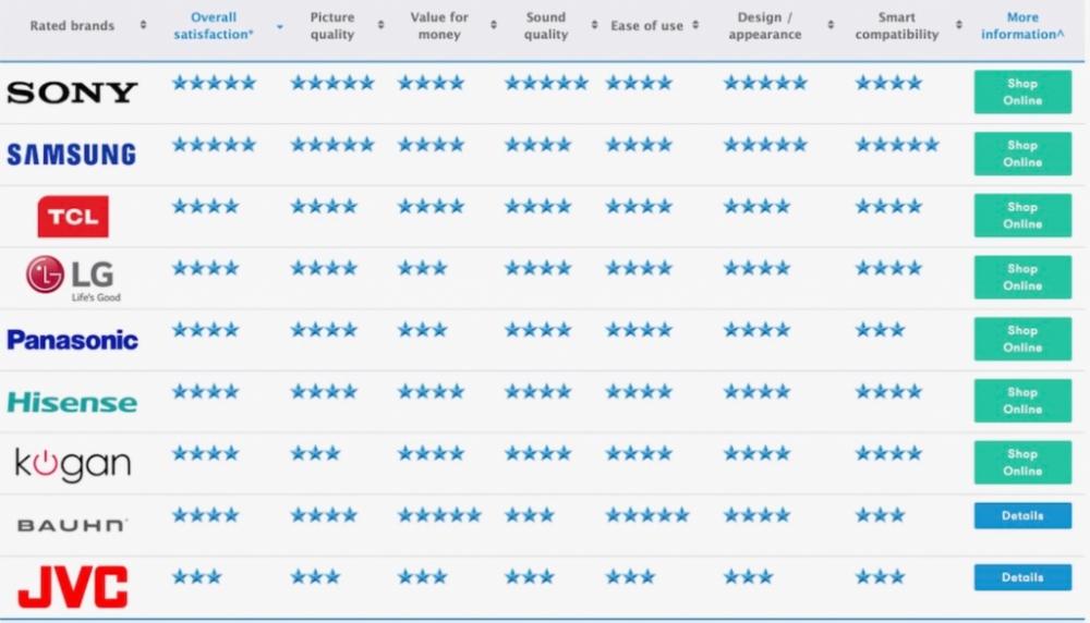 캔스타 블루는 호주에서 텔레비전을 구입한 1200명 이상의 구매고객에게 TV 의가치, 음질, 사용 편의성, 화질 등 다양한 카테고리에 걸쳐 등급을 조사했다.