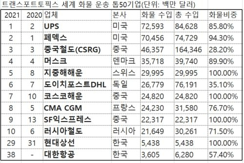 이밖에 중국의 코스코해운도 3계단 올라 7위, 프랑스의 CMA CGM이 8위, 중국의 SF익스프레스가 9위, 러시아의 러시안철도가 10위를 차지했다.