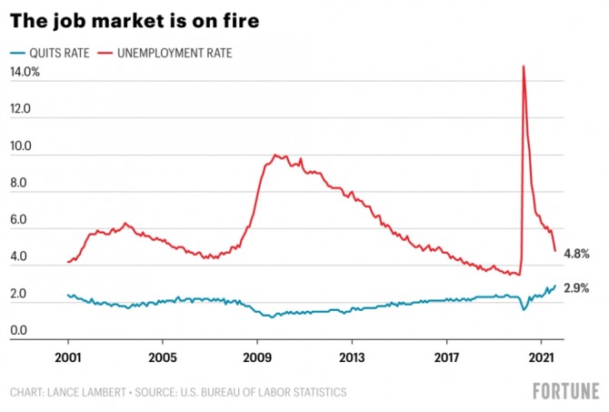지난 10월에 미국에서 비어 있는 일자리 숫자가 구직자 숫자보다 360만 개가 많았다. 지난 2020년 2월과 비교할 때 올해 11월 미국의 노동 인구는 240만 명이 줄었다. 이는 미국의 노동 시장에서 여전히 근로자들의 이직과 퇴직 등 ‘대탈출’이 이뤄지고 있다는 의미이다. 미국의 근로자들이 코로나19 대유행과 새로운 변이 출현 등으로 대면 근무가 불가피한 일자리를 거부하고, 일부 부모는 육아 등을 이유로 직장으로 복귀하지 않고 있다고 전문가들이 분석했다.