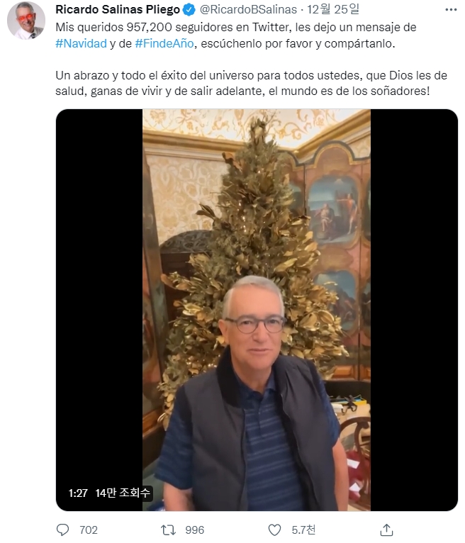 이미지 확대보기코인텔레그래프는 27일(현지 시간) 멕시코에서 세 번째로 부유한 사람인 리카르도 살리나스 플리에고(Ricardo Salinas Pliego)가 크리스마스 이브에 비트코인(BTC) 애호가들에게 새해 메시지로 2분짜리 축제 비디오를 통해 법정 화폐에서 벗어나 비트코인을 구매할 것을 권장했다고 보도했다.