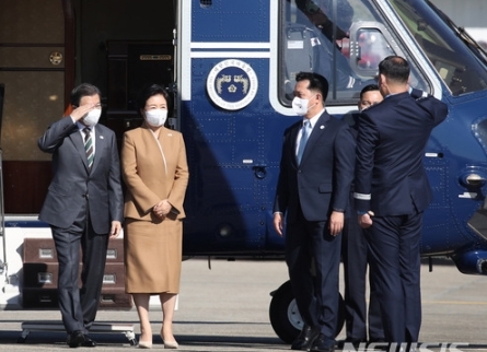 이미지 확대보기문재인 대통령과 김정숙 여사가 6박 8일간의 일정으로 아랍에미리트연합(UAE), 사우디아라비아, 이집트 등 중동 3개국을 방문하기 위해 15일 오전 성남 서울공항에서 공군 1호기를 이용 출국했다. 이번 문재인 대통령의 순방에는 새 대통령 전용기로 채택된 공군 1호기인 보잉 747-8i 기종이 순방에 투입됐다.