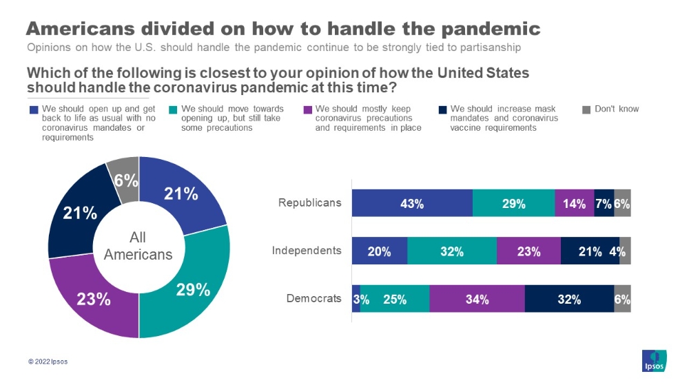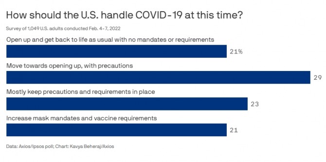 오미크론 변이의 확산으로 하루 최대 100만명 이상의 코로나19 확진자가 나왔던 미국에서 오미크론발 대유행이 정점을 지났다는 관측이 나오고 있는 가운데 최근 실시된 미국 국민 대상 여론조사에서 위드코로나에 대한 미국인들의 속마음이 드러났다.