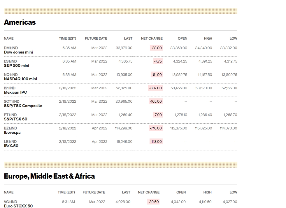 뉴욕증시 정규장은 대통령의 날 공휴일로 하루쉰다. 그러나 뉴욕증시 선물거래는 그대로 이어진다 뉴욕 증권거래소(NYSE)에서 지난 주말 다우존스30산업평균지수는 전장보다 232.85포인트(0.68%) 하락한 34,079.18로 마쳤다. 스탠더드앤드푸어스(S&P)500지수는 전장보다 31.39포인트(0.72%) 떨어진 4,348.87로, 그리고 기술주 중심의 나스닥 지수는 전장보다 168.65포인트(1.23%) 밀린 13,548.07로 거래를 마감했다. 비트코인은 계속 떨어져 3만 7000달러대로 추락했다.