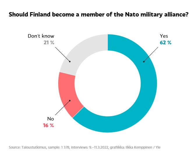 핀란드에서는 핀란드경제정책포럼(Eva)이라는 싱크탱크가 지난달말 실시한 여론조사에서 응답자의 60%가 나토 가입에 찬성하고 19%가 반대한다는 결과가 나왔고 핀란드 공영방송 YLE이 별개로 벌인 여론조사에서도 응답자의 62%가 나토 가입을 지지하는 것으로 나타나는 등 나토 가입 추진에 유리한 여론이 빠르게 확산되고 있다.